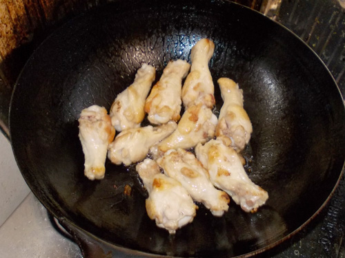 ●30秒くらい待って鶏肉をお鍋に投入!(油はね注意)。 写真くらいの焼き色がつくくらいまで両面を焼きます。